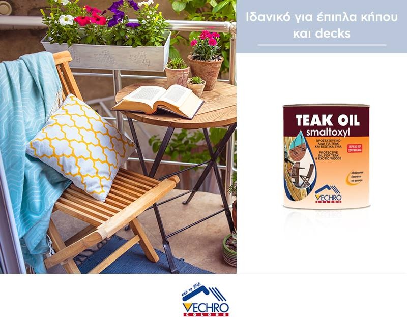 Το Smaltoxyl TEAK OIL είναι άχρωμο ειδικά επεξεργασμένο λάδι συνδυασμένο με κερί αδιαβροχοποίησης για τη συντήρηση και το φρεσκάρισμα σκληρών ξύλων όπως τικ, μαόνι, ιρόκο και άλλα εξωτικά ξύλα. Κατάλληλο για εσωτερική και εξωτερική χρήση. Αντικαθιστά τα φυσικά έλαια των σκληρών ξύλων που χάνονται λόγω της φθοράς από το χρόνο.