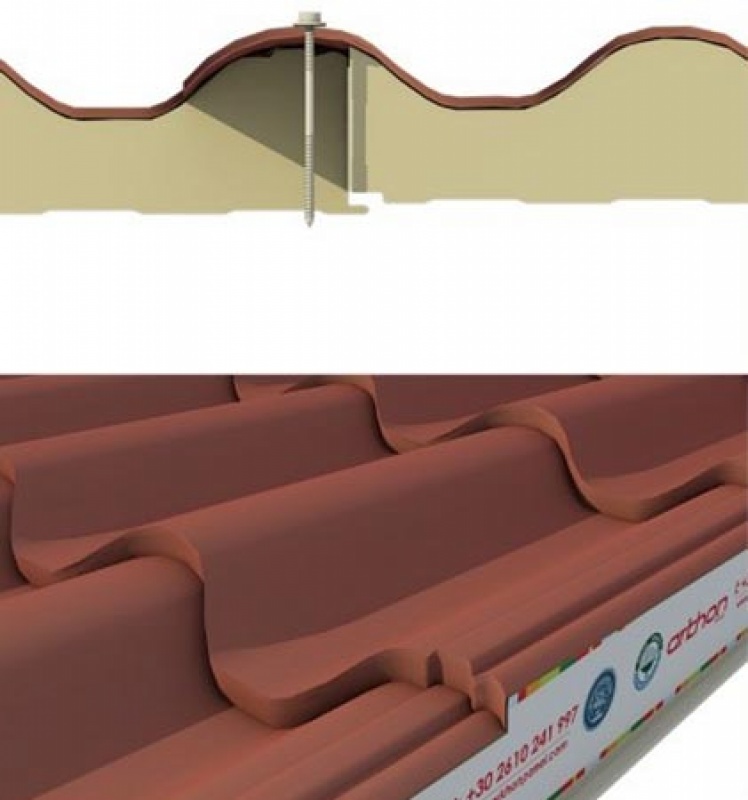 Θερμομονωτικό πάνελ οροφής πολυουρεθάνης σχήμα κεραμιδιού ρωμαικού. Κωδικός προϊόντος: Διαθεσιμότητα: Κατόπιν παραγγελίας Ρωτήστε για τιμή Χαρακτηριστικά Πάνελ οροφής σχήμα κεραμιδιού ρωμαικού.Είναι το μονωτικός μεταλλικός πίνακας πολυουρεθάνης στο σχήμα των παραδοσιακών Roman με μοναδική αισθητική. Το ρωμαϊκό κεραμίδι μπορεί να χρησιμοποιηθεί σε πλήθος εφαρμογών όπως π.χ. σε μεταλλικά κτίρια,αθλητικές εγκαταστάσεις,μπορεί να χρησιμοποιηθεί ως προσθήκη και αντικατάσταση στην υπάρχουσα κατασκευή κατοικιών (μεταλλική ή συμβατική), προσφέροντας εξαιρετικό οπτικό αποτέλεσμα και κυρίως ενεργειακή αναβάθμιση του κτιρίου.και γενικά σε όλες τις εφαρμογές που απαιτούν επένδυση οροφής. Υψηλή θερμομόνωση (λ=0,022 / U=0.258 kcal/m²h°C) Για την ολοκληρωμένη και σωστή τοποθέτηση των πάνελ οροφής Arkhon Roman Tile, απαιτούνται μία σειρά ειδικών τεμαχίων ούτως ώστε να πραγματοποιηθεί απόλυτα το μονωτικό και αισθητικό αποτέλεσμα της εκάστοτε κατασκευής. Διαθέσιμο σε ματ εξωτερικες αποχρώσεις RAL 8004 ΚΕΡΑΜΙΔΙ,RAL 1015 ΜΠΕΖ,RAL7015 ΓΚΡΙ, RAL6005ΠΡΑΣΙΝΟ,RAL3013, εσωτερικές αποχρώσεις RAL9002, ΞΥΛΟΥ ΑΝΟΙΚΤΟ ,ΞΥΛΟΥ ΣΚΟΥΡΟ καθώς και σε παλαιωμένη βαφή 100% εξασφάληση υδατοστεγανότητας